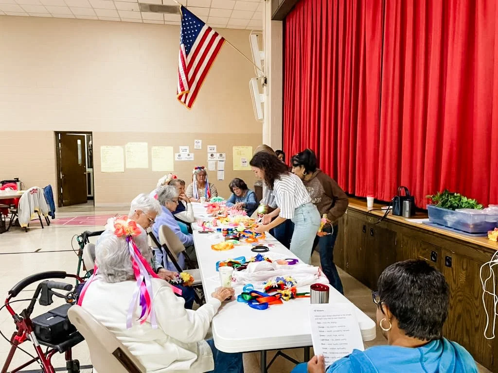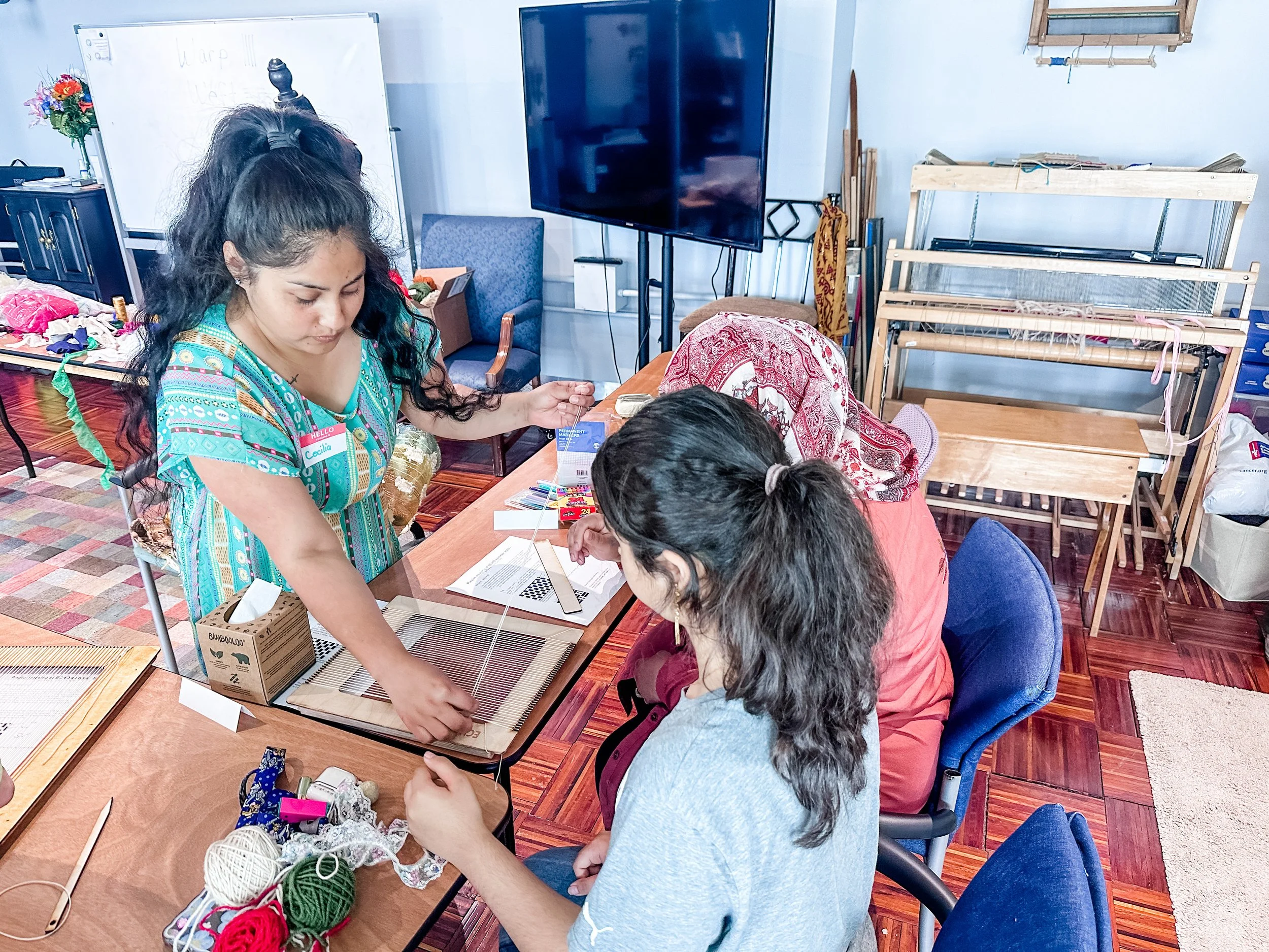 This may include a weekly textile circle where women gather to create and connect, weaving classes that build on cultural practices, or time spent in the community, such as leading creative sessions at the Washington Street Senior Center.